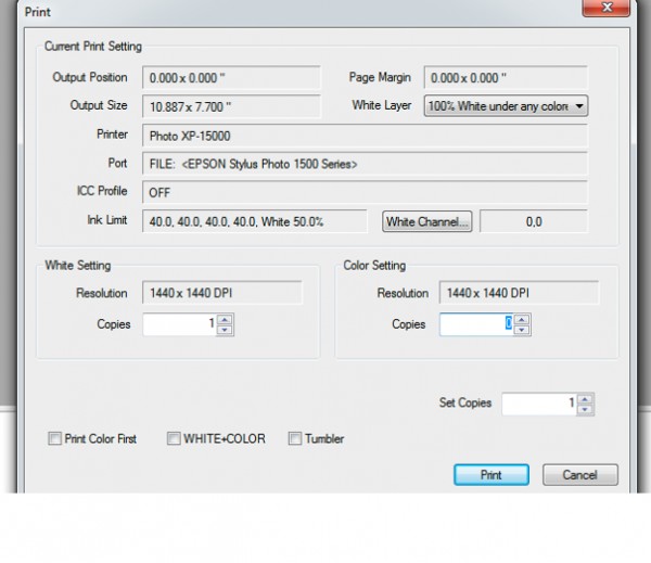 Then proceed and select Print and make sure that White copies is selected to 1 and everything else is 0 and not checked.